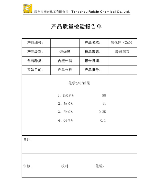 瑞興化工有限公司是生產(chǎn)氧化鋅的重點企業(yè),于2008年通過ISO9001:2008質(zhì)量管理體系認(rèn)證。“瑞興”牌氧化鋅在國內(nèi)擁有較大穩(wěn)定的市場,并遠(yuǎn)銷東南亞、中東、中南美等國家和地區(qū),在國內(nèi)外享有較高聲譽。